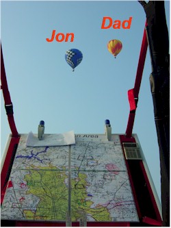 Each pilot had to fly into a common goal. Pilots choice of launch spot. Launch had to be 3km from common goal. Each pilot had to choose a goal (PDG) at least three km past the common goal. We were allowed to choose two targets. The target we chose would also be the first leg of an elbow. An elbow is where you try to fly back the way you came. This makes your choice of PDG very important since it will be the starting point of your Elbow. We all came in on the first target flying side by side. Tree topping for left. Got to the field and I actually had to drop my marker around Jon. Jon waited a little longer and dropped right on the X. Dad was further off but in the target field. Then it was climb climb climb to find the layer to take us to the furthest right of our two chosen pilot declared goals. As we were about half way to the PDG the radio went blank. We could not talk to anyone nor could we talk to each other. Someone was jamming the frequency. The radio signal was so powerful we could not even talk over it between each other in the balloons. Come to find out that my sister had put the microphone in the cup holder in the van depressing the talk button. This went on for almost 30 minutes.