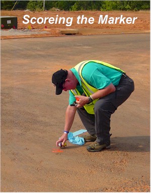 The marker had gotten caught in the top of a tree. A BIG TREE! The marker was more than 85 feet in the air! No way to climb up and worried about getting penalty points for loosing a marker we were all in poor spirits. We even tried throwing small apples at it to knock it down but it was soooo high up in the tree that we could not even throw an apple that high! After several phone calls to the scoring officials we determined that it was not a lost marker but just an unrecoverable marker. We scored the drop as if it had fallen to the ground.