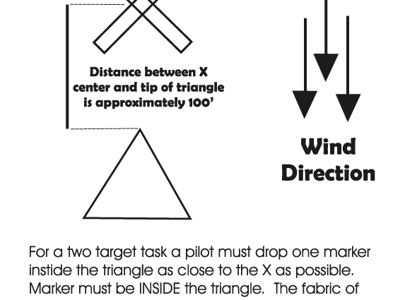 This is a competition test event. No landing at the field. Two targets. White marker on Target 1 and a Yellow marker in the triangle. See drawing for details.