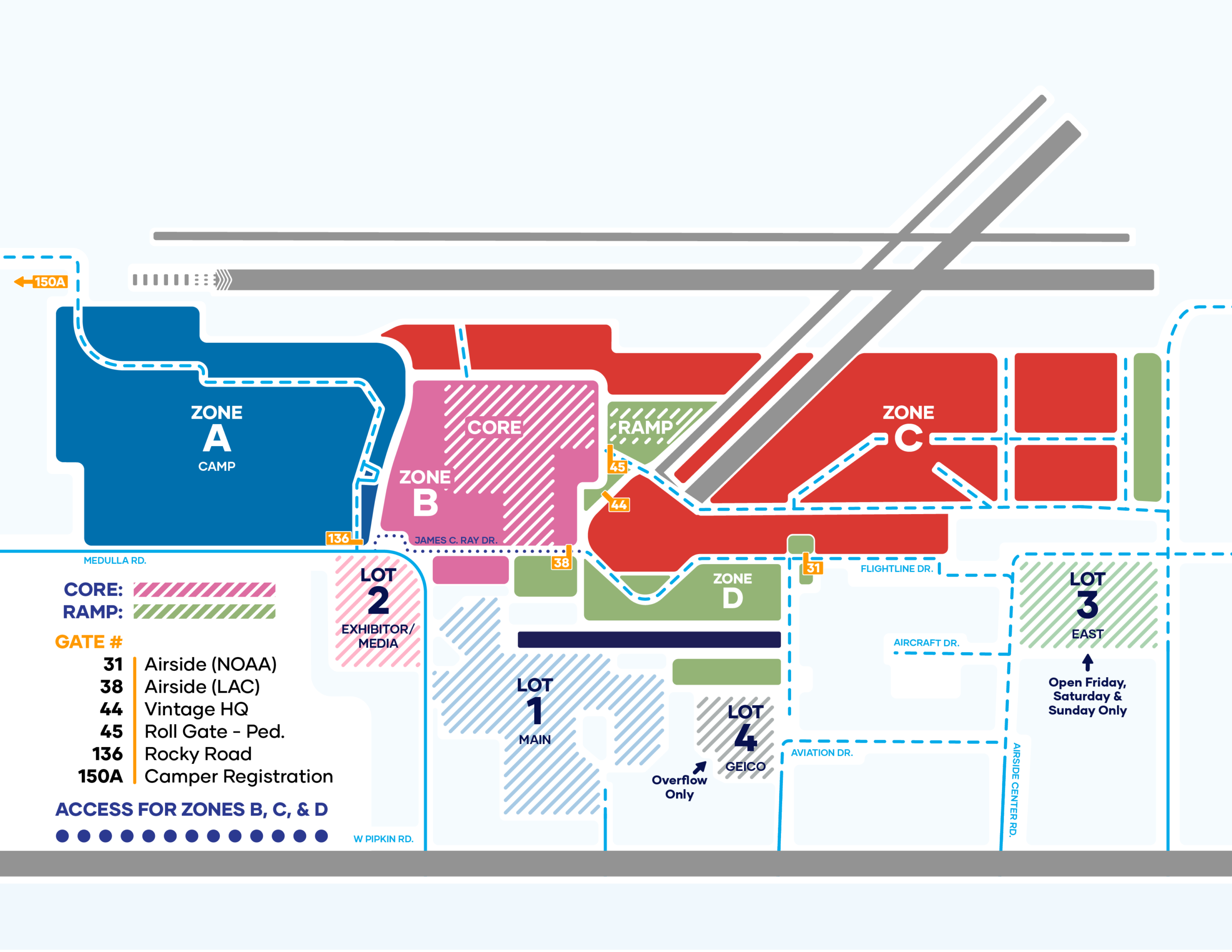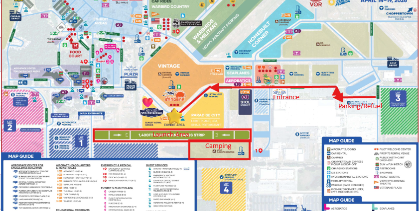 All crew and passengers will need to park in the Pink Parking/Refueling Lot located outside the gate and ride in with your pilot.